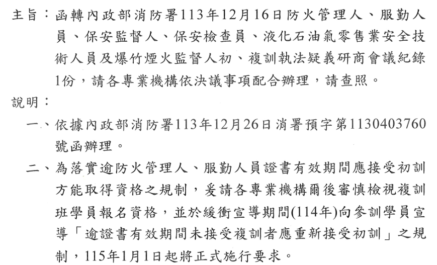 依「防火管理人訓練與專業機構登錄及管理辦法」第3條第2項規定,防火管理人應在其訓練合格證書有效期間內接受複訓。另內政部消防署113年12月26日消署預字第1130403760號函釋,自115年1月1日起逾證書有效期間未接受複訓者應重新接受初訓,以符合規範。