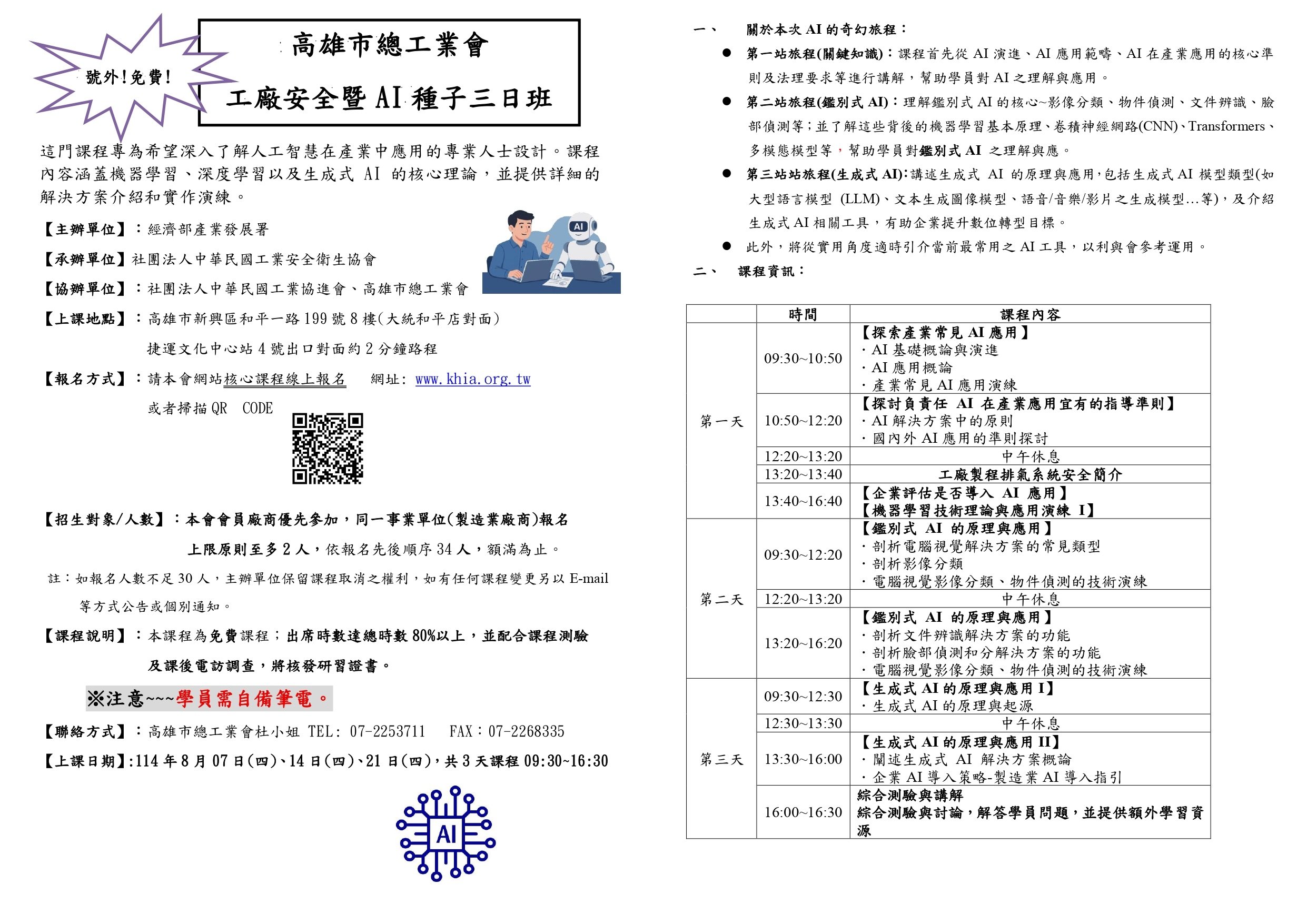 工廠安全暨AI種子三日班8/7、8/14、8/21~免費課程!!