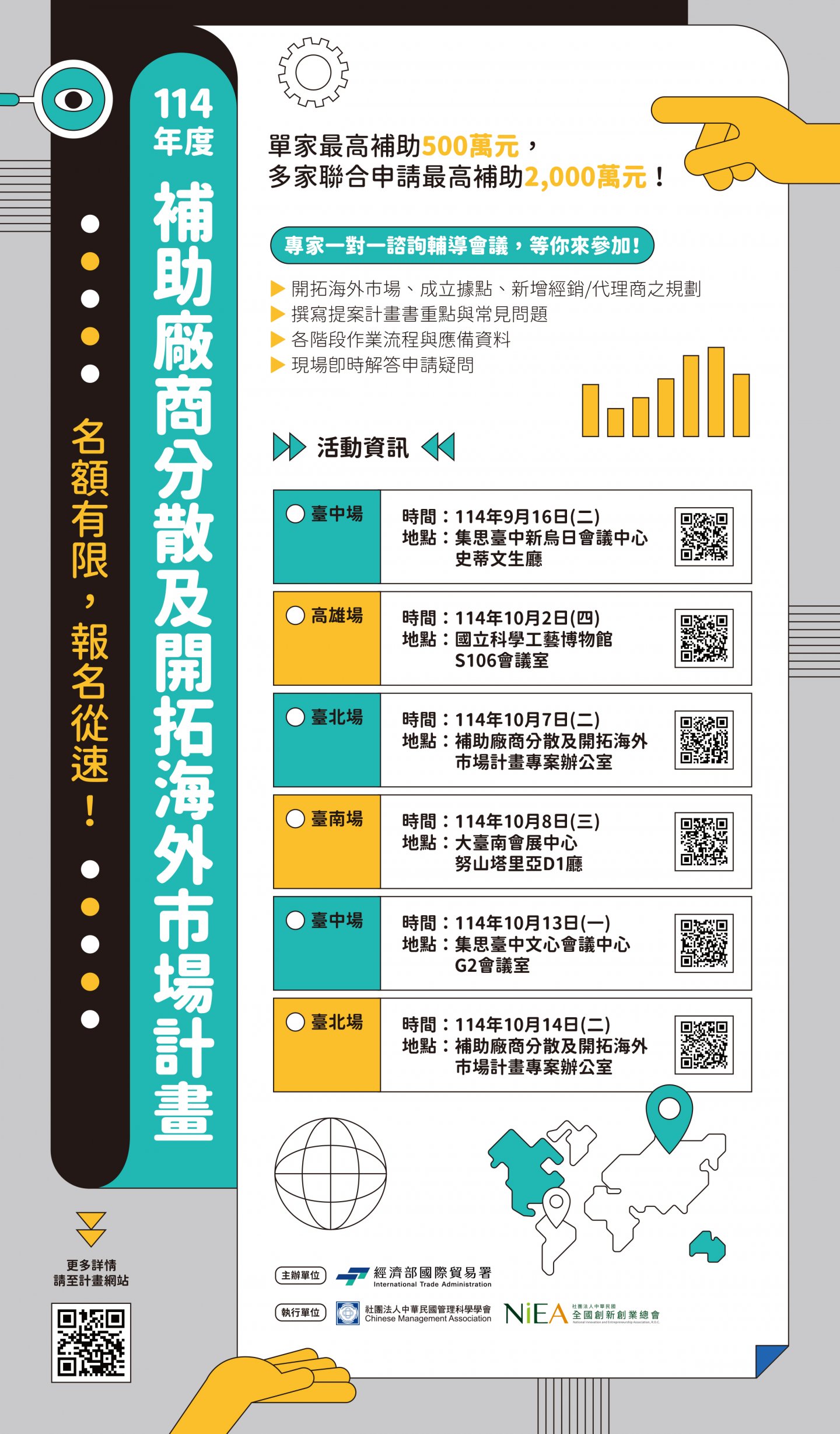 為協助我國企業拓展海外市場、爭取訂單,經濟部國際貿易署推動「114年度補助廠商分散及開拓海外市場計畫」,單家企業最高補助500萬元,多案企業聯合申請最高補助2,000萬元,為使廠商能深入瞭解計畫及申請內容,將舉辦北中南諮詢輔導會議(詳如附件) 轉知會員廠商踴躍參與~~ 高雄場日期、地點:114年10月2日下午 高雄國立科學工藝博物館S106會議室 高雄場報名連結:https://docs.google.com/forms/d/e/1FAIpQLSfN-l4IookL9ZVshU_jGYO_j31PfQr46zalRD9WQ-szb0kEsw/viewform
