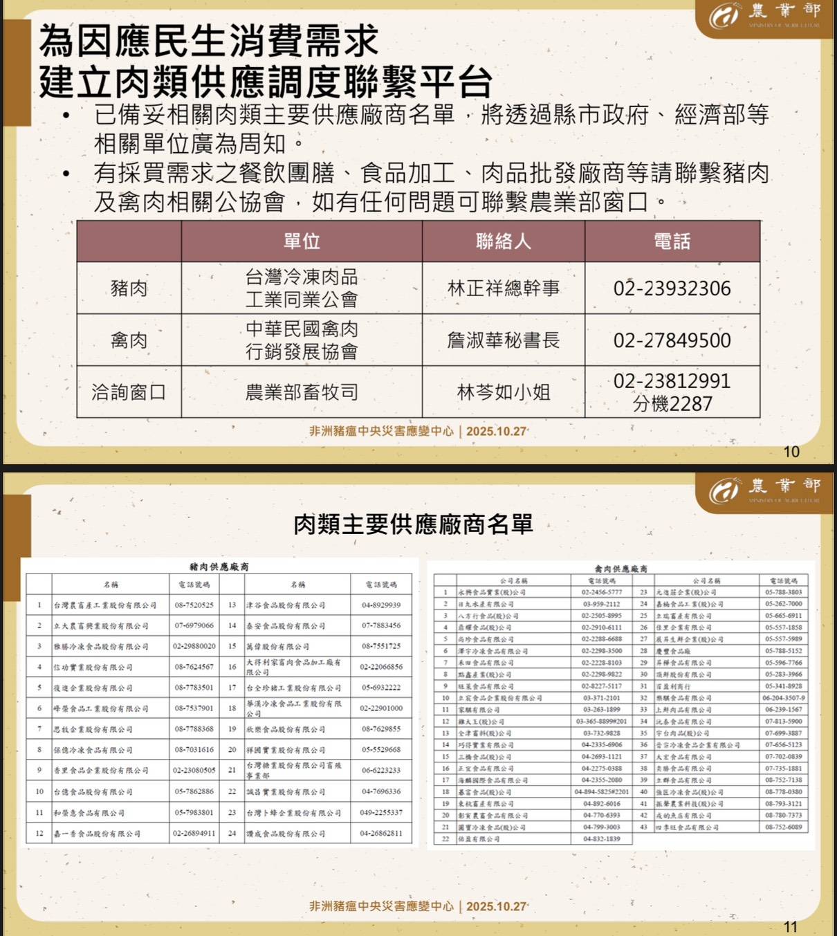 為因應民生消費需求,農業部已彙整肉類主要供應廠商名單(